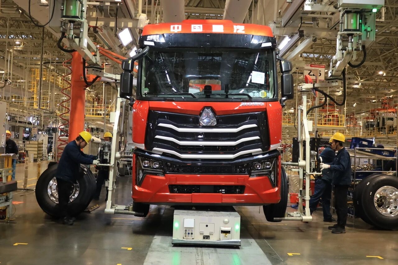 在智能化提效上,莱芜工厂生产线上221台机器人实现了装配、焊接、涂胶等工艺的自动化,焊点自动化率达到100%;173台AGV小车按设定轨道进行着零件配送、工作站之间物料传输等工作;总装车间双线布局,柔性生产可以支持柴油、天然气、氢能等多能源车型共线生产,双线平均每5分钟下线两辆重型卡车。